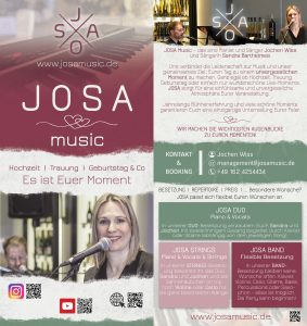 Für eine Trauung im klassischen Sinne oder Hintergrundmusik bei einer kleineren Firmenveranstaltung eignet sich am besten eine kleine Besetzung mit Piano und Gesang (siehe Duo). Eine Geige oder ein Cello verleihen dem Ganzen dann etwas Pep und heben es von dem sonst so gängigen musikalischen Beitrag ab, also sehr zu empfehlen, wenn es Euer Geldbeutel hergibt (siehe Strings). Natürlich kommen wir auch besonderen Wünsche entgegen und sind durch unser Netzwerk bestens gerüstet, um auch mit kompletter Band oder einfach nur ergänzt um Gitarre, Percussions und/oder Bass auf eure Bedürfnisse zu reagieren.
